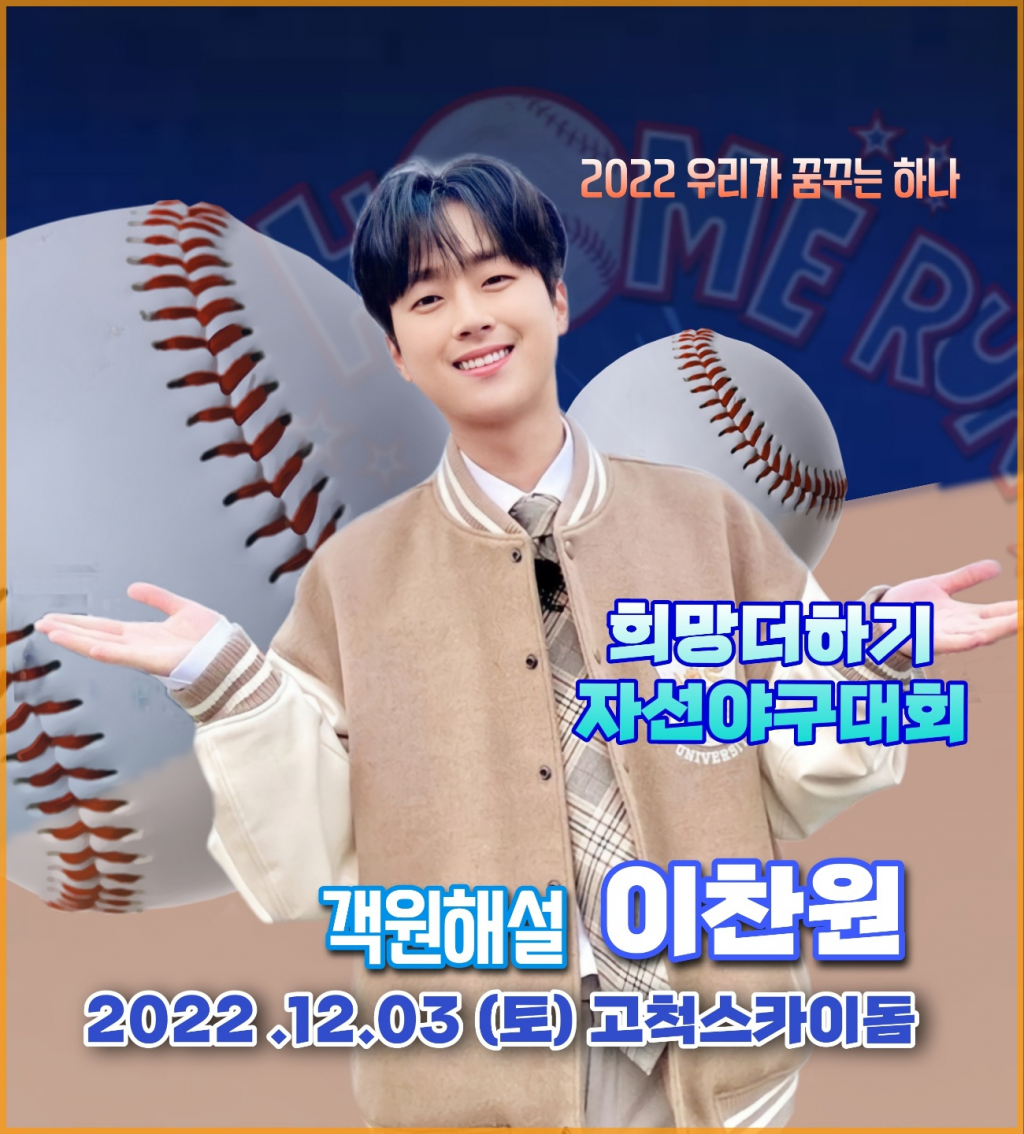 이찬원은 12월 3일 서울 고척스카이돔에서 열리는 '2022 희망 더하기 자선 야구대회'에 객원 해설위원으로 활약한다.