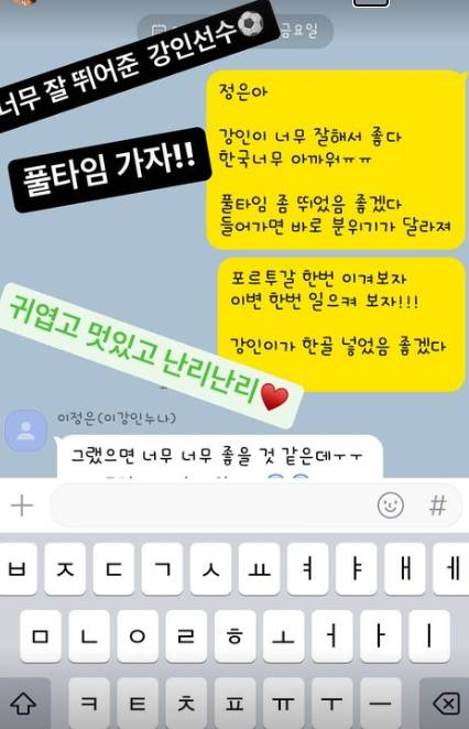 전미라는 이 메시지들을 공개하며 "너무 잘 뛰어준 강인 선수 귀엽고 멋있고 난리 난리♥", "오늘의 기도 이뤄졌다"고 흐뭇함을 전했다.