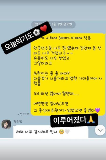 이어 그는 "원치 않게 아프기도 했고 주전이 되지 않아 혹시 그라운드에서 못 뛸까봐 매일 매일 가족의 마음으로 기도하고 누나들한테 응원 보내고 안부 묻고 진짜 피말렸는데... 기도가 닿았나봐요. 하나님 감사합니다. 황희찬 선수 '미라 누나'라고 써서 보내준 싸인티 너무 고마워요♥"라고 황희찬, 이강인에 대한 애틋한 마음을 전했다.