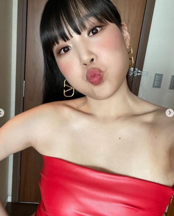공개된 사진 속 이은지는 빨간색 가죽 드레스를 입고 브이를 한 채 카메라 앞에서 포즈를 취하고 있다. 또 다른 사진에서는 입술을 오리처럼 내민 채 상큼한 매력을 뽐내고 있다. 그의 어깨라인과 드레스 소화력이 보는 이들의 시선을 사로 는다.