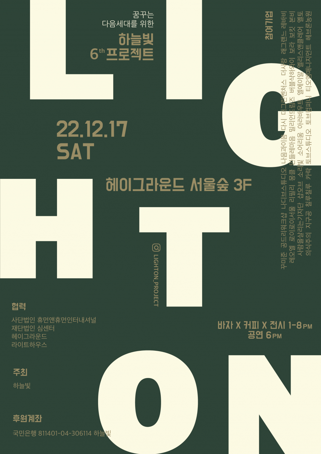 꿈꾸는 다음세대를 위한 '2022 6th 하늘빛 프로젝트'(주최: 하늘빛)는 12월 17일 토요일 오후 1시부터 8시까지 서울시 성동구 헤이그라운드 서울숲점 3층에서 열린다. 올해 '하늘빛 프로젝트'는 소외계층을 위한 겨울 아우터 기부 바자를 비롯해 아티스트들의 멋진 공연과 전시회까지 더욱 풍성하고 다채롭게 채워진다.