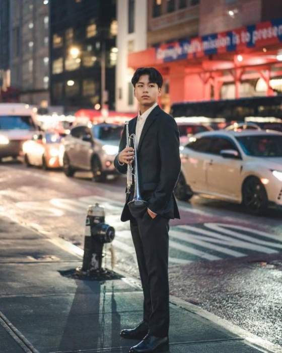 사진 속에는 양복을 입은 리환 군이 뉴욕 거리에서 트럼펫을 들고 감성적인 자태로 서있었다.