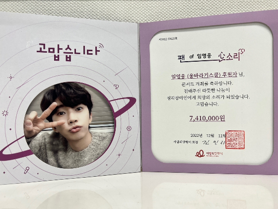 지난 11일 '웅바라기스쿨'은 임영웅이 감동과 위로가 담긴 임영웅 전국투어 콘서트 'IM HERO'와 부산, 서울 앙코르 콘서트를 성황리에 마친 기념으로 청각장애인을 지원하는 사단법인 사랑의 달팽이에 741만원을 전달했다.