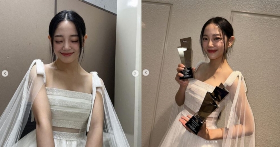 공개된 사진 속 김세정은 트로피 두 개를 들고 미소 지었다. 김세정은 흰색드레스로 여신 비주얼을 뽐냈다.