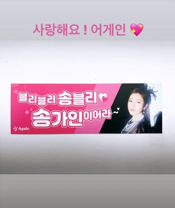 공개된 사진에는 송가인 팬덤 어게인(Again)의 송가인 응원 문구가 담겼다. 문구는 '블리블리 송블리♥ 송가인이어라~'다.