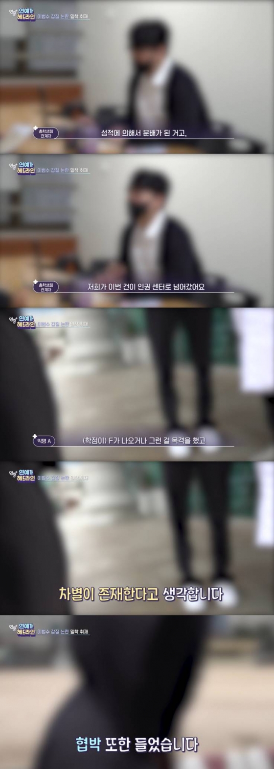 '연중' 제작진은 재학생들에게 이범수 사태에 대해 아냐고 물었지만 재학생들은 대부분 "잘 모르겠다"고 말했다. 이 가운데 익명의 학생은 "확실히 어떤 학생은 출석도 제대로 하고 과제를 온전히 제출했는데 F가 나온 걸 목격했다"며 "어떤 학생은 과제도 제대로 안 내고 출석도 온전하지 않았는데 A를 받거나 높은 성적을 받아서 차별이 존재한다고 생각한다"고 주장했다.