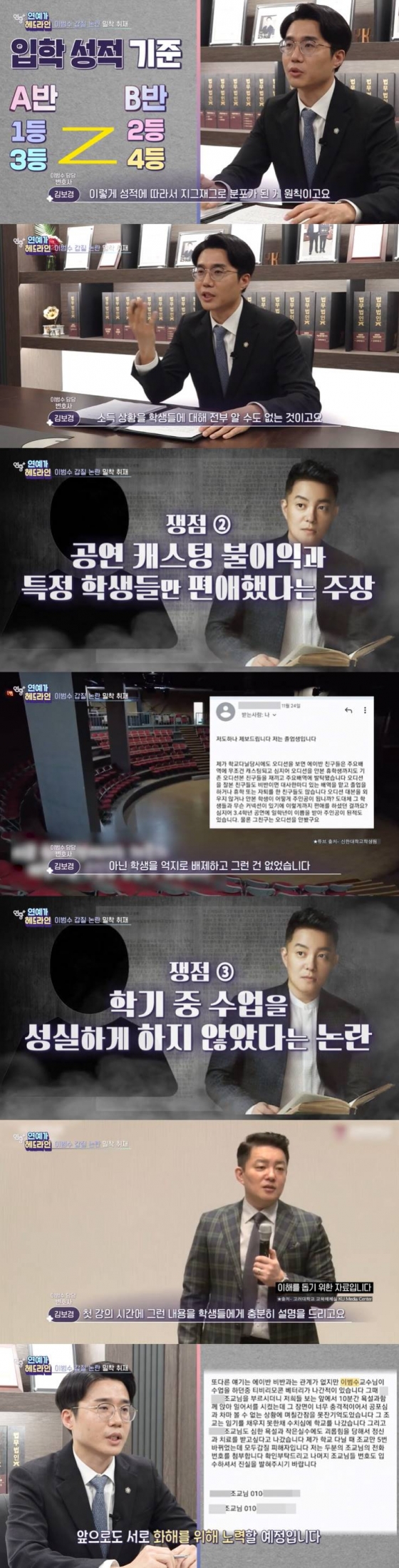 이범수 측 법률대리인인 김보경 변호사는 "입학 성적 기준에 따라 지그재그로 1등이 A반, 2등이 B반, 3등이 A반, 4등이 B반으로 가는 게 원칙"이라며 "빈부 격차에 따라서 소득 상황을 학생들에 대해 전부 알 수도 없는 것"이라고 말했다.