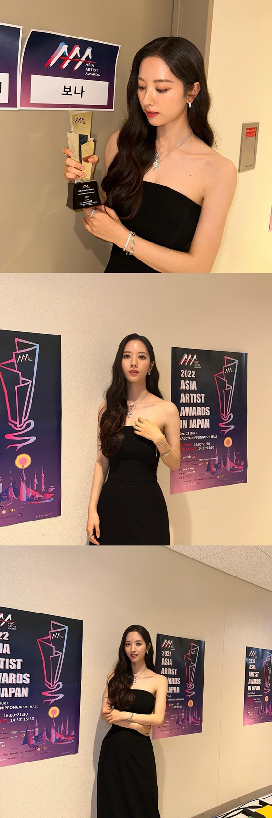 공개된 사진에는 블랙 드레스를 입고 '여신미'를 뽐내고 있는 보나의 모습이 담겼다. 보나는 '2022 Asia Artist Awards IN JAPAN'(2022 아시아 아티스트 어워즈, 이하 '2022 AAA')에서 수상한 AAA 베스트 액팅 퍼포먼스 상 트로피를 들고 있다.