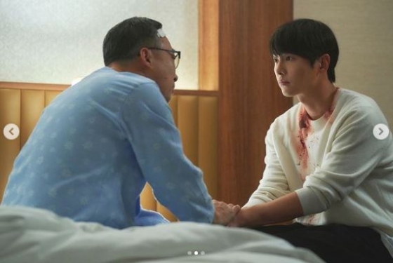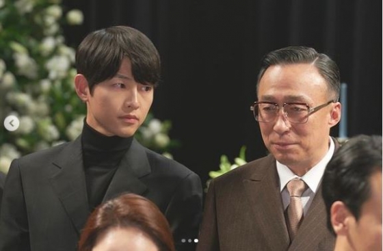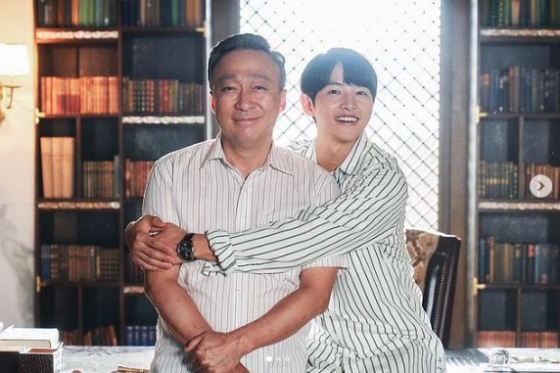 공개된 사진 속 송중기는 드라마 '재벌집 막내아들'에서 자신의 할아버지 역을 맡은 이성민을 껴안고 해맑게 미소 지었다.