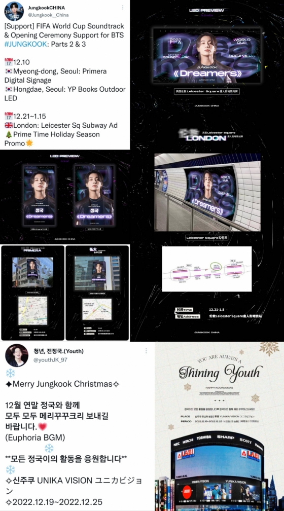 방탄소년단(BTS) 정국의 팬들이 홀리 데이 시즌을 맞아 영국과 일본에서 전광판 광고로 훈훈한 팬심을 보여줬다.