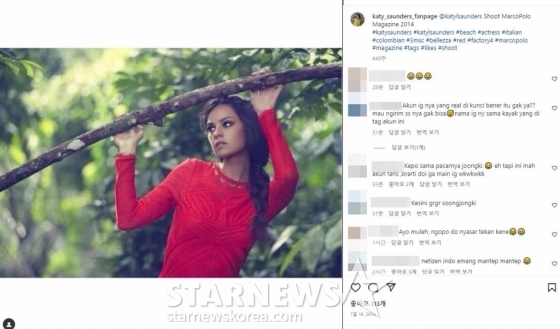 27일 케이티 루이스 사운더스의 팬페이지로 알려진 한 인스타그램 계정에는 송중기의 해외 팬들이 몰려와 댓글을 남기고 있다.