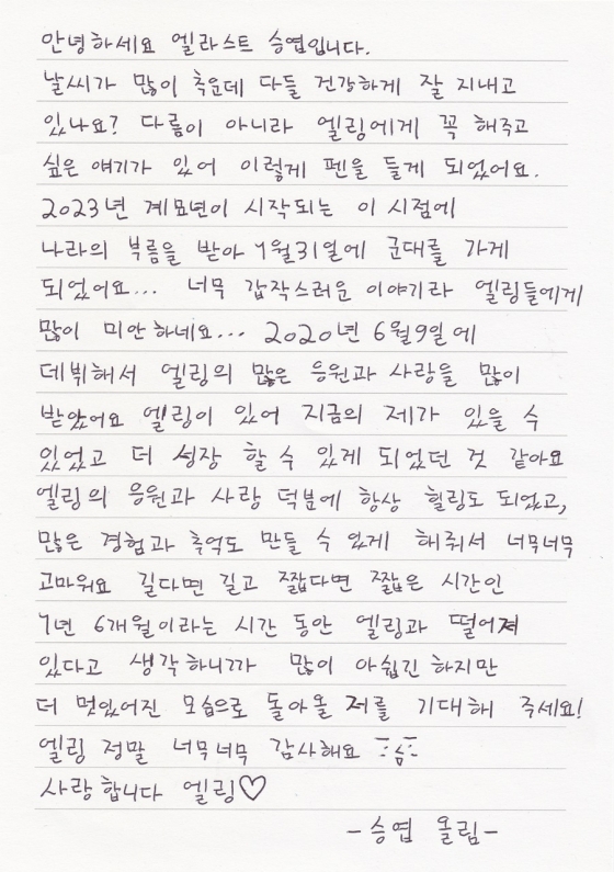 승엽은 이날 엘라스트 공식 SNS 계정을 통해 손으로 직접 쓴 자필 편지를 게재하며 팬들에게 입대 소식을 공식화했다.