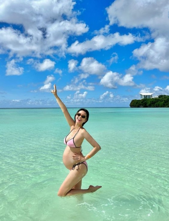 공개된 사진에는 임신 중인 지소연이 만삭의 배를 한 채 해변에서 비키니를 입고 있는 모습이 담겼다. 그는 "이때 배는 지금에 비하면 아주 귀엽네요. 지금은 아주 킹 왕 수박만 한 내 배. 사진 찍을 엄두가 안 나네요. 막달 이렇게 힘든 거구나. 존경합니다. 모든 어머니들"이라는 글을 덧붙였다.