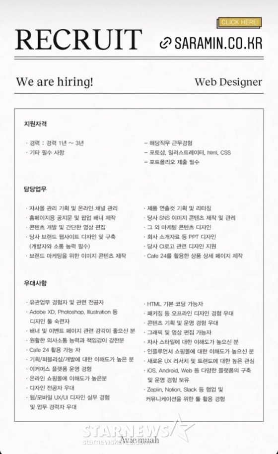 이와 함께 공개된 강민경 쇼핑몰의 공고문에는 1~3년의 경력직을 모집한다며 네티즌이 언급한 그 이상의 경력직 업무를 쇼핑몰이 원하는 담당업무로 나열했다.