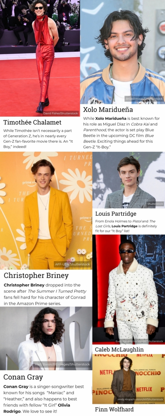 또 '잇 보이'라는 제목에 가장 먼저 떠올릴 수 있는 사람은 티모시 샬라메(Timothee Chalamet)일 것이라며 "이 할리우드배우는 Z세대는 아니지만(1995년생) Z세대에 큰 영향을 미치는 많은 히트 작품에 출연했다"며 '잇 보이'에 선정했다.