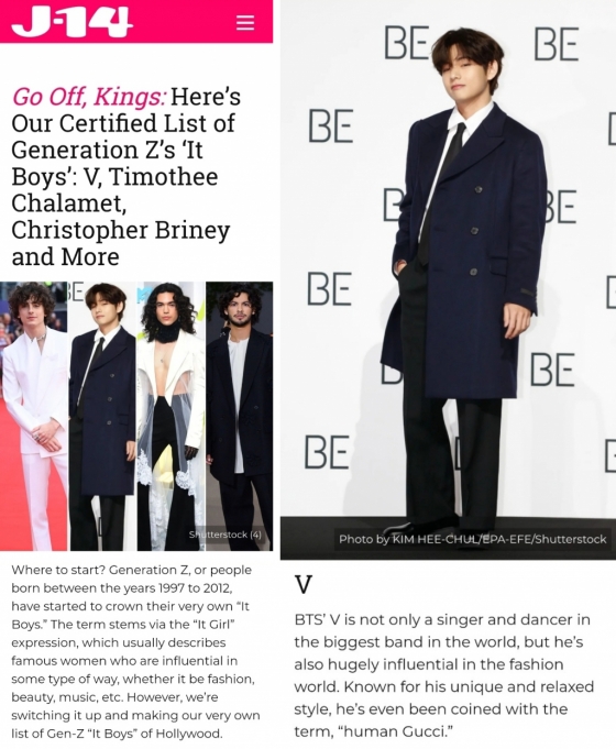 J-14 매거진은 "Z세대의 킹 '잇 보이' 인증 목록: 뷔, 티모시 샬라메, 크리스토퍼 브리니 등"이라는 기사를 통해 패션, 뷰티, 음악 등 다양한 장르에서 영향력이 있는 대표적인 셀럽 8명을 발표했다.
