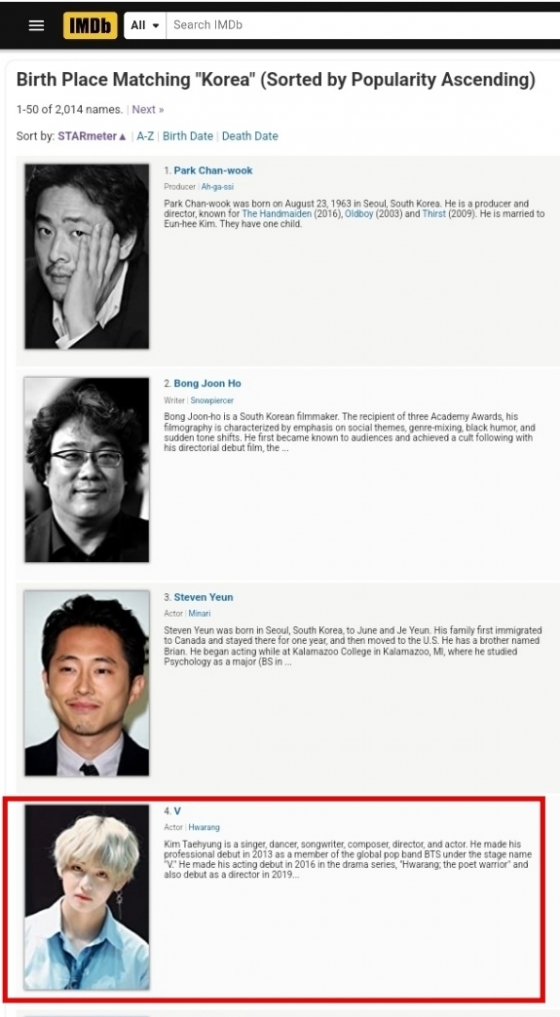 방탄소년단(BTS) 뷔가 세계 최대 영화 사이트에서 '한국 영화인 인기 순위' 4위에 오르며 '배우 김태형'에 대한 기대감을 엿보게 했다.
