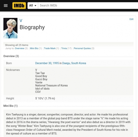 IMDb는 뷔를 "김태형은 가수, 댄서, 작곡가, 감독 그리고 배우다. 2013년 뷔라는 예명으로 방탄소년단의 멤버로 데뷔, 2016년 드라마 '화랑'에서 연기자로, 2019년에는 자작곡인 '윈터 베어'의 뮤직비디오 감독으로도 데뷔했다"고 소개했다.