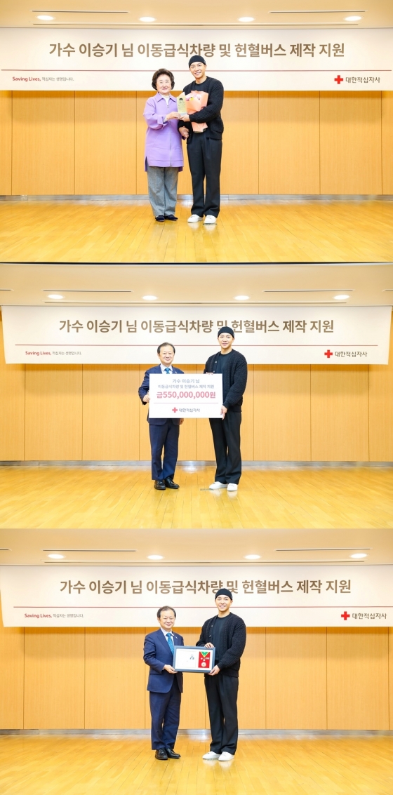 이승기는 13일 재난구호 활동 지원을 위한 이동급식차량과 혈액 부족 문제 해소를 위한 헌혈버스 제작 지원금 5억 5천만 원을 대한적십자사(회장 신희영)에 전달했다.