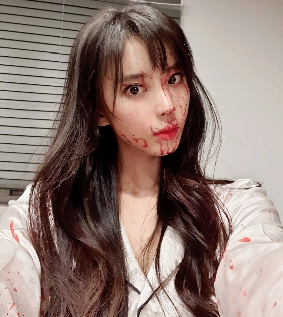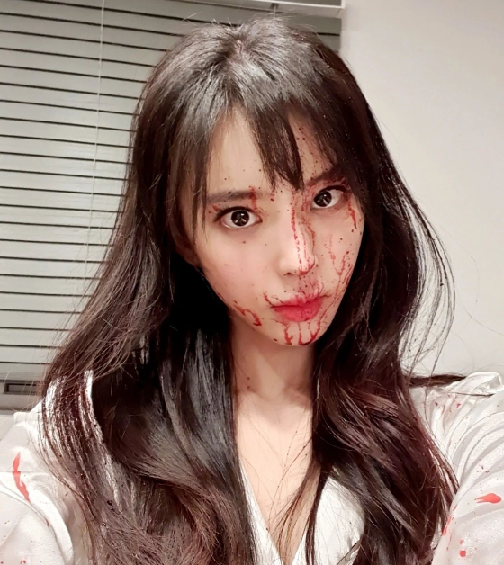 공개된 사진에는 김지은이 밝혔듯이 '살벌함'이 고스란히 느껴진다. 얼굴에 피가 잔뜩 튄 분장을 한 김지은의 표정은 섬뜩하다.