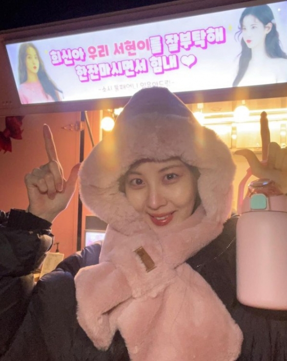 공개된 사진에는 서현이 목도리로 얼굴을 싸맨 채 선물 받은 커피차 앞에서 포즈를 취하는 모습이 담겼다. 그는 입꼬리를 올리며 사랑스러운 미소를 뽐내 시선을 끌었다.