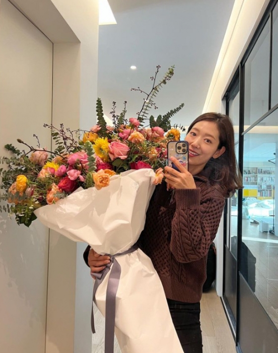 공개된 사진 속 박신혜는 자신의 상체만큼 큰 꽃다발을 들고 함박웃음을 짓는다. 특히 그는 출산 후 밝은 모습을 보여 이목을 끈다.