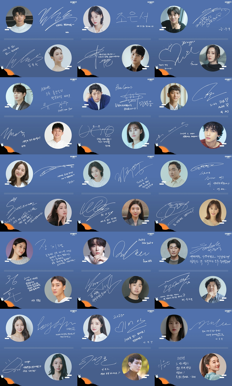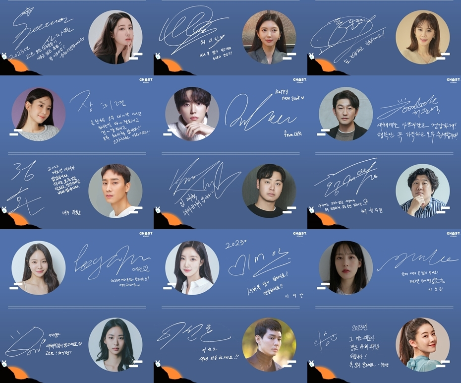 이와 같이 고스트 스튜디오 소속 아티스트 김성오, 김옥빈, 류경수, 류성록, 민진웅, 박세완, 송상은, 신지원, 양현민, 오현경, 음문석, 이다희, 이서안, 이선호, 이소진, 이승윤, 이유진, 이이담, 이태희, 임재혁, 장희령, 정환, 조은서, 주원, 차주영, 채서진, 최권, 최태준, 허준석, 황재열은 입을 모아 2023년 따뜻한 한 해가 되길 바라며 팬들에게 따뜻한 새해 인사를 건넸다.