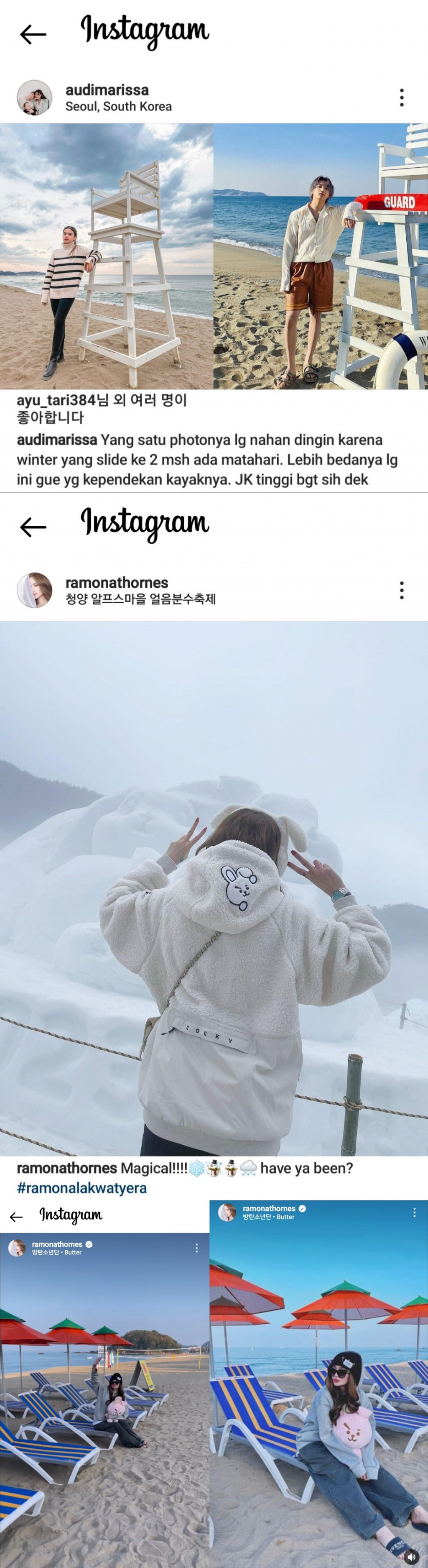 인도네시아 유명 배우 아우디 마리사(Audi Marissa)는 강원도 삼척 맹방 해변을 방문해 정국의 '버터'(Butter) 앨범 재킷 화보를 커버한 사진을 인스타그램을 통해 공개해 팬들의 주목을 받았다.