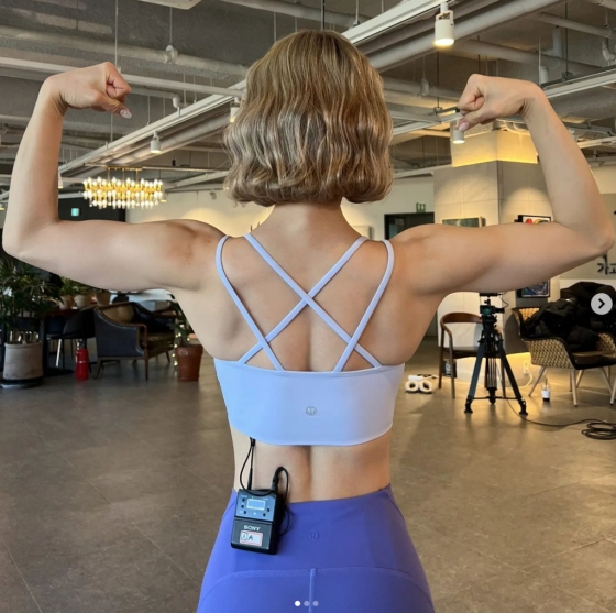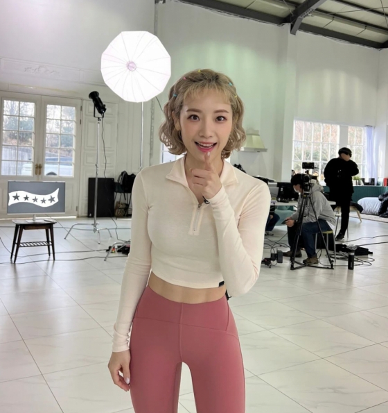 사진에서 심으뜸은 촬영에 한창인 모습이다. 심으뜸은 브라톱 레깅스 복장을 하고 탄탄한 등 근육과 힙 라인을 과시하고 있다.
