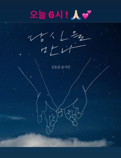 공개된 사진은 김호중과 송가인의 듀엣곡 '당신을 만나' 포스터다. 두 손을 모은 이모티콘, ♥ 이모티콘까지 더한 송가인의 깜찍한 홍보가 눈길을 끈다. '당신을 만나'는 팝 발라드 장르로, 사랑하는 사람에게 바치는 고마움을 전달하는 곡이다.