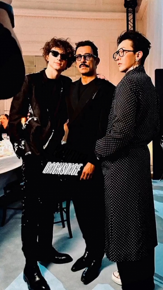 공개된 사진 속 지드래곤은 검정 뿔테 안경을 쓰고 도트 무늬 옷을 입은 채 남다른 아우라를 자랑하고 있다. 지드래곤 옆 티모시 샬라메 역시 선글라스를 쓴 채 시크한 모습으로 훈훈한 비주얼을 뽐내고 있다.