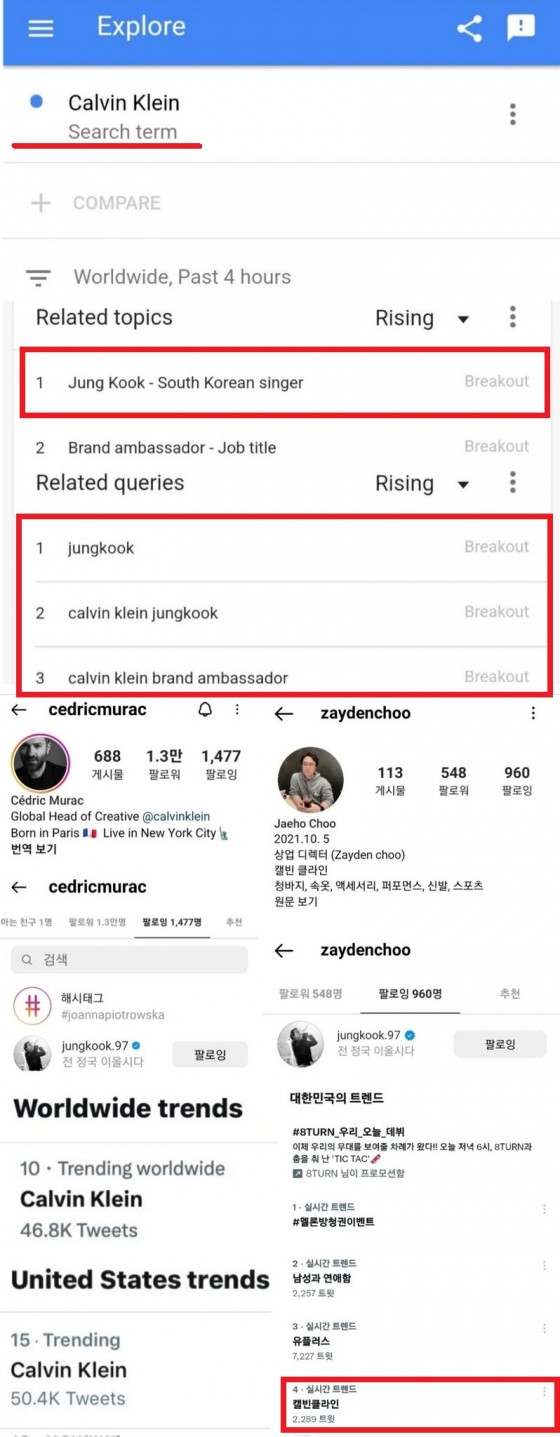 이와 함께 세계 최대 검색 엔진 구글에서 'Calvin Klein' 키워드의 전세계 '관련 주제'(Related Topics)와 '관련 질문'(Related Queries)에 정국의 이름이 1위에 올랐다.