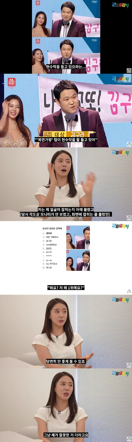 이어 "(김구라의 대상 수상으로) 분위기가 정말 좋았다. 그렇게 다 끝나고 나서 차에 탔는데, 회사에서 전화가 왔다. 제가 실시간 검색어 1위라고 하더라"고 말했다.