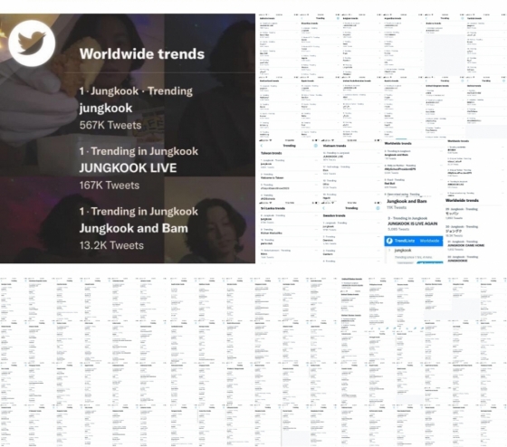 트위터에서는 정국 관련 키워드 'jungkook', 'Jungkook and Bam', 'JUNGKOOK LIVE', '치킨 먹방' 등이 월드와이드(전세계) 트렌드 1위를 비롯해 88개 국가 실시간 트렌드에 올랐다.