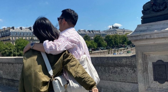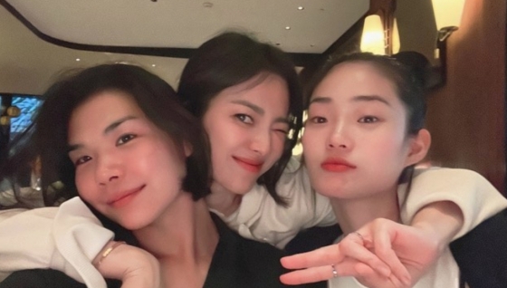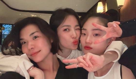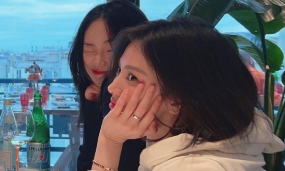 사진에서 송혜교는 지인들과 파리를 배경으로 행복한 시간을 보내고 있다.