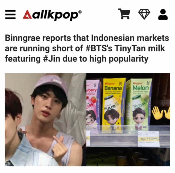 미국 연예매체 올케이팝(Allkpop)은 최근 "인도네시아 시장에서 진 캐릭터가 그려진 BTS 타이니탄 우유가 높은 인기로 품귀 현상"이라는 제목의 기사를 통해 소식을 전했다.