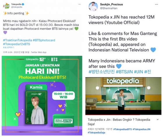 매체는 진의 이미지가 들어가거나 진이 언급한 제품들은 인도네시아에서 불티나게 팔려나가고 있다며 일례로 프리미엄 토코피디아 진 포토카드는 30초만에 완판되며 큰 화제가 됐다고 언급했다.