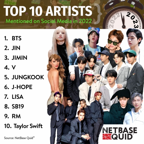 진은 또 미국의 소셜미디어 분석업체이자 소비자 시장정보 플랫폼 '넷베이스 퀴드'(NetBase Quid)가 발표한 전 세계 소셜 미디어 '2022년 가장 많이 언급된 아티스트 톱10' 솔로 1위, 그룹을 포함한 모든 아티스트 중 자신이 속한 방탄소년단 다음인 TOP2를 차지하는 등 최강 인기와 영향력을 보였다.