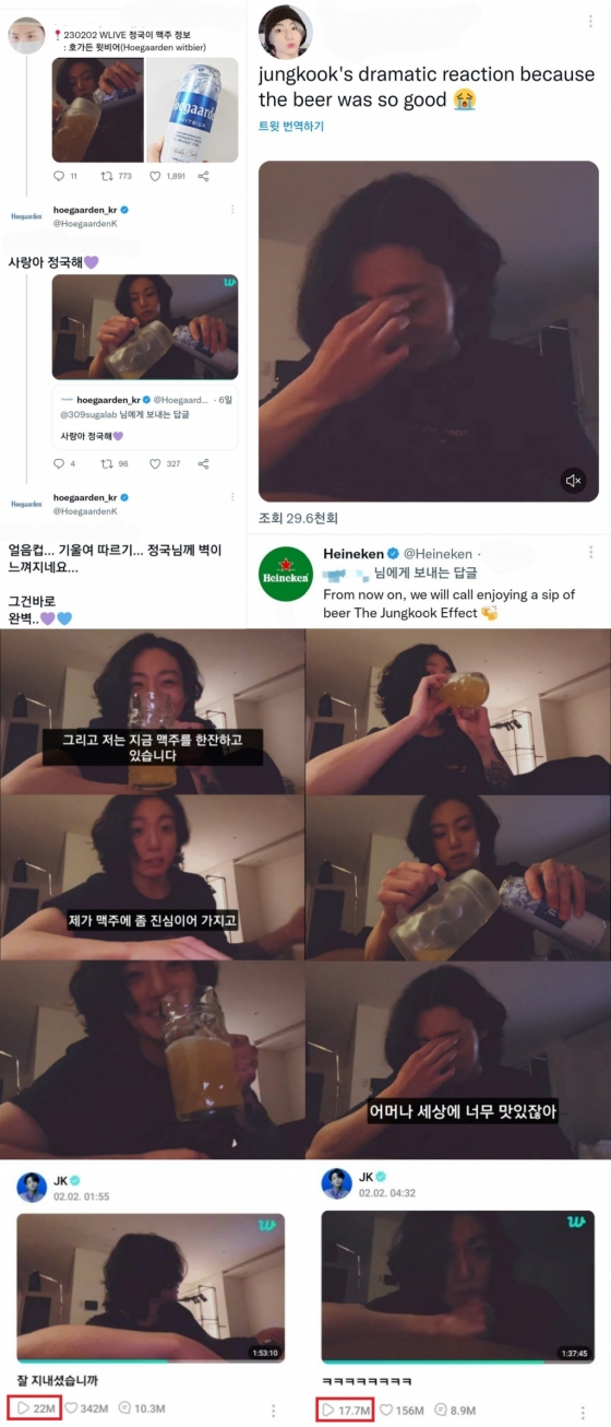 하이네켄은 정국이 맥주를 한 모금 마신 뒤 "어머나~세상에~너무 맛있잖아!" 라는 리얼 감탄사와 '진실의 미간'을 드러내는 장면이 담긴 방송 영상 게시물에 "지금부터 우리는 맥주 한 모금 즐겨 마시기를 정국 효과라고 부를 거야"(rom now on, we will call enjoying a sip of beer The Jungkook Effect) 라고 댓글을 게재하며 홍보에 슬쩍 가담했다.