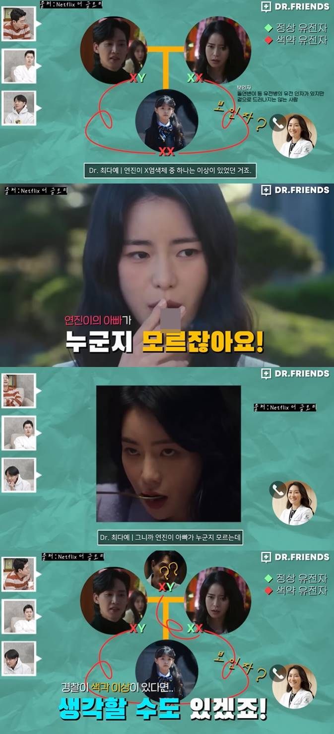 영상에서 우창윤 내과 전문의는 "'더 글로리'에서 재준(박성훈 분)이 적록 색약이고 연진(임지연 분)은 색약이 아닌데 딸(하예솔 역, 오지율 분)이 적록 색약이다. 이런 게 가능한 얘기냐"라고 질문했다.