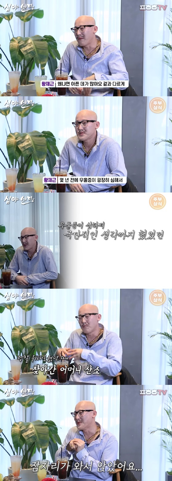 이에 황재근은 고개를 끄덕이며 "겉과 다르게 아픈 데가 많아서 항상 병원에 간다. 지금은 좀 괜찮아졌는데 몇 년 전엔 우울증이 굉장히 심해 엄마를 따라가고 싶더라"고 털어놨다.