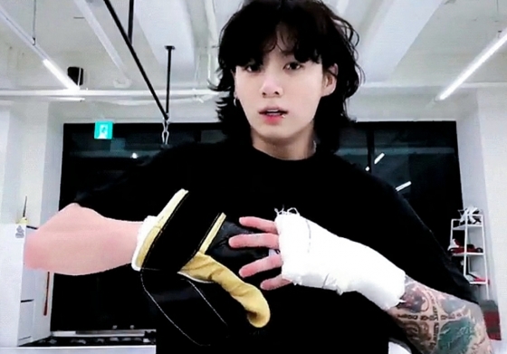 먼저 정국은 체육관으로 보이는 장소에서 트레이너와 함께 복싱을 선보였다. 정국은 너무 오랜만이란 말이 무색하게 날렵한 몸놀림이 돋보이는 강력한 펀치로 미트를 후려치며 수준급 복싱 실력을 보여줬다.