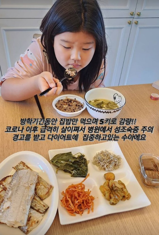 이동국의 아내 이수진은 14일 "방학 기간 동안 집밥만 먹으며 5키로 감량!!"라며 수아의 근황을 공개했다.