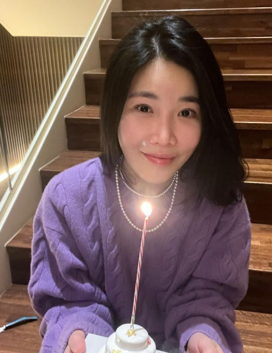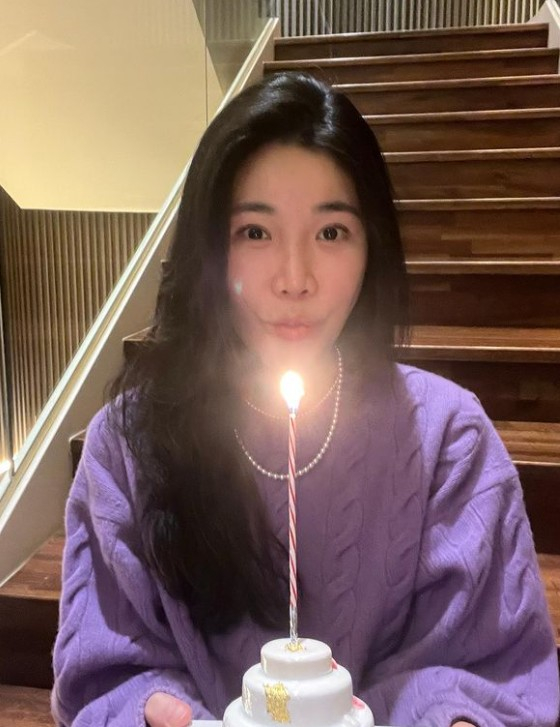 공개된 사진에는 보라색 니트를 입은 이해리가 머리를 풀어 헤친 채 촛불이 붙은 케이크를 들고 미소를 짓는 모습이 담겼다.