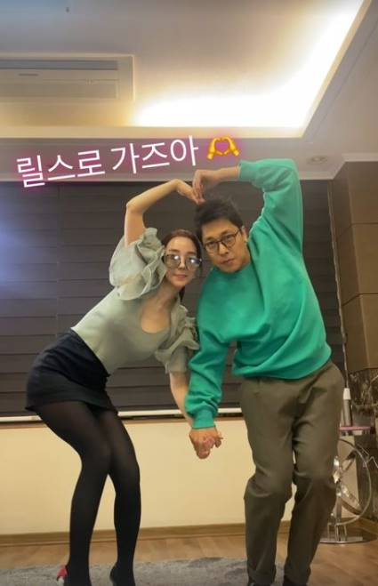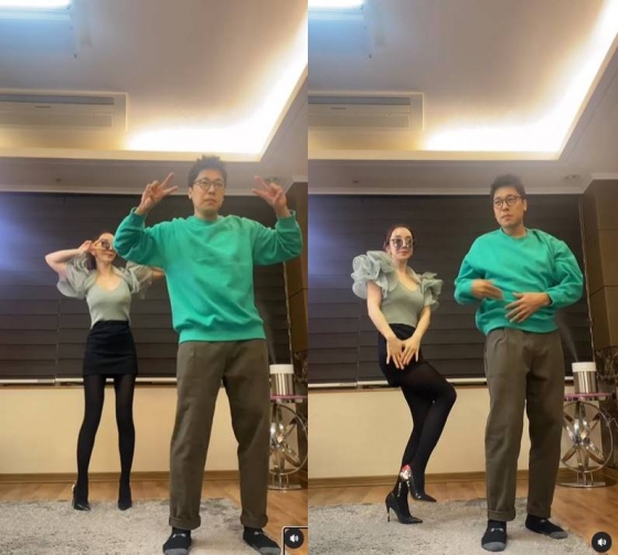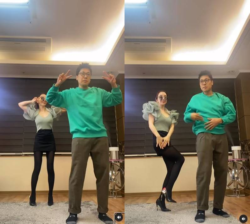 영상 속 김동성은 재혼한 아내 인민정과 노래에 맞춰 흥겹게 커플 댄스를 추는 모습이다. 두 사람은 브이자 포즈, 머리 위 하트 포즈 등으로 애정을 과시했다.