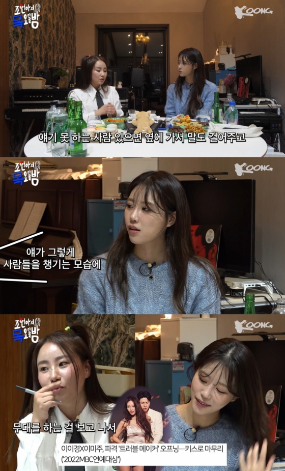 이날 조현아는 이미주에 대해 "얘기 못 하는 사람 있으면 말도 걸어준다"라고 칭찬했다. 이미주는 "이게 중요한 게 우리 인원이 진짜 많지 않았나. 근데 한 명이 말을 하고 집중을 안 하면 다른 사람이 말해버려. 그래서 집중을 해주는 거다. 얘가 그렇게 사람들을 챙기는 모습에 나도 그렇게 해야겠다고 생각했다"라고 말했다.