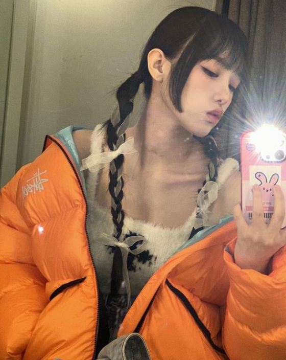 공개된 사진 속 최예나는 주황색 패딩을 입고 양갈래로 땋은 머리를 한 채 거울 셀카를 찍고 있다. 그의 작은 얼굴과 귀엽고 새침한 표정이 보는 이들의 시선을 사로 잡는다.