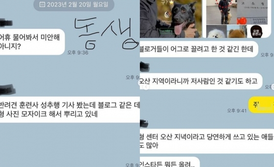 공개된 사진에는 강형욱이 한 지인과 나눈 대화 내용이 담겨 있다. 대화 속 지인은 강형욱에게 "물어봐서 미안해 아니지?"라고 물은 뒤 "반려견 성추행 기사 봤는데 블로그 같은데 형 사진 모자이크해서 뿌리고 있다"고 알렸다.