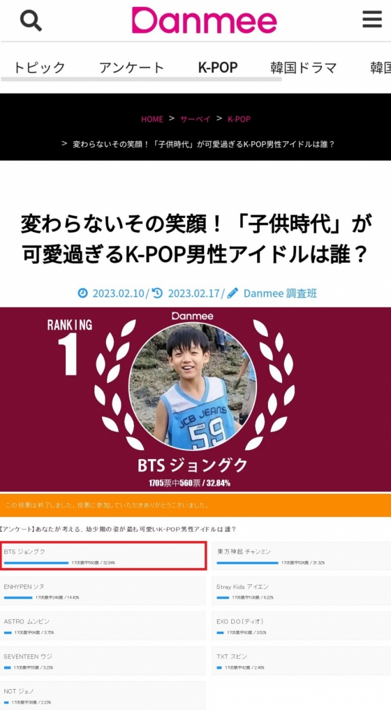정국은 일본 K팝, 한류 전문 미디어 '단미'(Danmee)에서 2월 10일부터 2월 17일까지 진행된 '어린 시절 모습이 너무 귀여운 K팝 남자 아이돌은 누구?' 설문에서 1위를 차지했다.