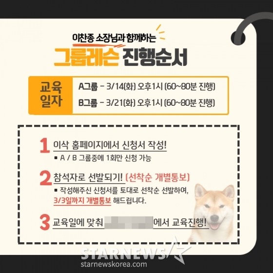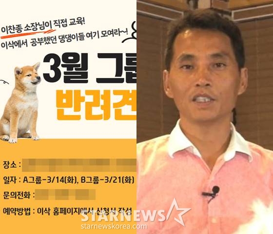 22일 스타뉴스 확인 결과, 이찬종 소장이 대표로 운영하는 이삭애견훈련소에서는 공식 사이트에 '졸업생들 대상 그룹레슨 3월 클래스 OPEN!!'이란 공지를 올리고 클래스 수강 희망자를 대상으로 신청서를 받기 시작했다.